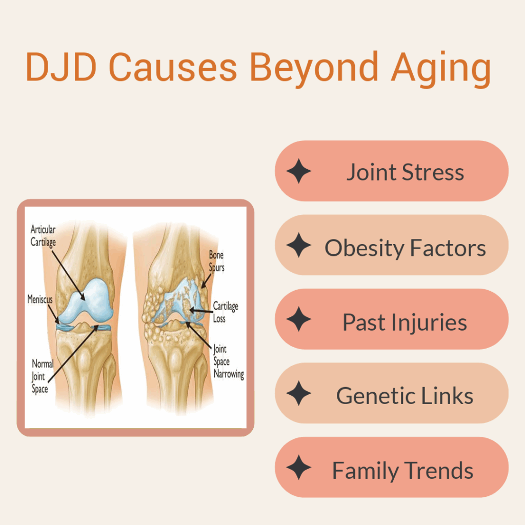 DJD, also known as osteoarthritis, isn’t just an aging issue. It involves the gradual wearing down of joint cartilage. This can happen at any stage of life. Causes vary, including physical stress on joints, obesity, or past injuries. Genetic factors also play a role. In India, people may notice a family tendency towards developing joint issues early on.